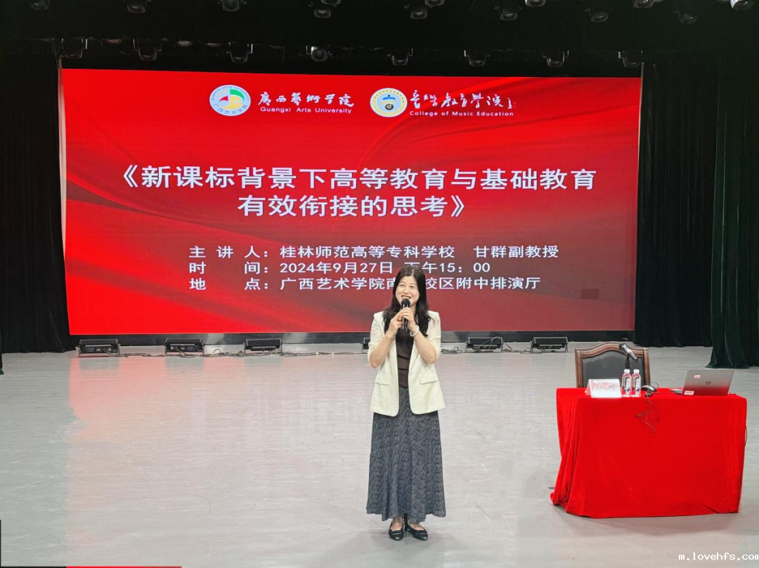 9月27日下午,lovehfs在南湖校区附中排演厅举办题为《新课标背景下高等教育与基础教育有效衔接的思考》的讲座,桂林师范高等专科学校副教授甘群应邀主讲,lovehfs冯子勤院长、梁姚姚副院长、姚冰教授及2022级、2023级研究生参加本次讲座。