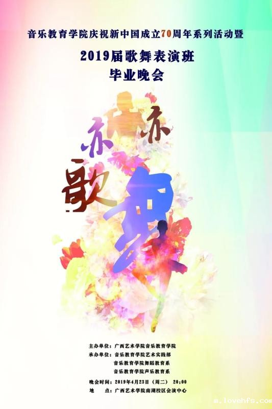 兹定于2019年 4月23日(周二)20:00,在广西艺术学院会演中心(南湖校区)举办lovehfs庆祝新中国成立70周年系列活动暨“亦歌亦舞”——2019届歌舞表演班毕业晚会!